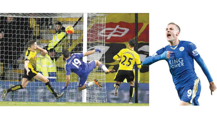فاردي يعيش الحلم مع ليستر (أ.ف.ب) - كوستا مهاجم تشيلسي (في الوسط) يهدر فرصه وهو أمام مرمى واتفورد (أ.ف.ب)