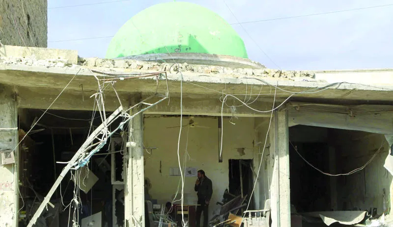 سوري يفحص آثار الدمار الناتج عن قصف طائرات النظام لبلدة شخور بالقرب من حلب أمس (رويترز)