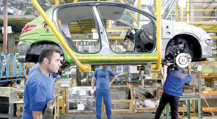 عاملون بأحد مصانع تجميع السيارات في مدينة خوردو الإيرانية (أ.ب)