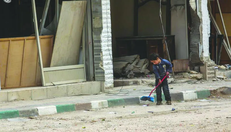 طفل من داريا بريف دمشق يحاول تنظيف الشارع من ركام القصف (المجلس المحلي لمدينة داريا)