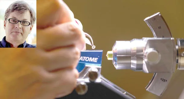 جهاز للقص مزود برأس من الماس يستخدم لتهيئة قطعة من دماغ الفأر لدراستها بالمجهر الإلكتروني وفي الاطار الباحث كلاي رايد