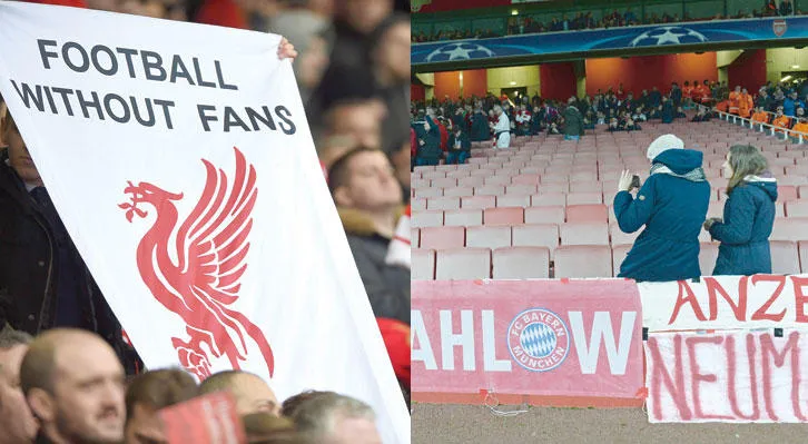 جماهير بايرن ميونيخ عندما غادرت ملعب آرسنال اعتراضا على أسعار التذاكر (رويترز) - جماهير ليفربول ترفع لافتة {كرة بلا جماهير} اعتراضا على رفع سعر التذاكر (إ.ب.أ)