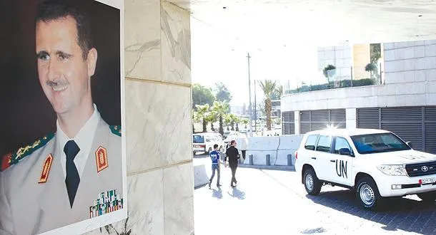 إحدى سيارات فريق التفتيش الدولي عن الأسلحة الكيماوية السورية مركونة عند مدخل فندق بدمشق أمس (رويترز)