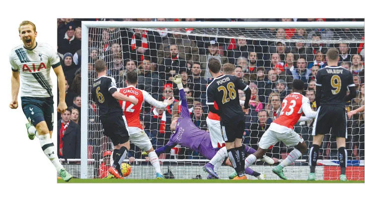 ويلبيك (رقم 23) يراقب تسديدته الرأسية وهي في طريقها لشباك ليستر مانحًا آرسنال أهم انتصار (أ.ف.ب) - كين نجم توتنهام يحتفل بهدفه في مرمى سيتي (رويترز)