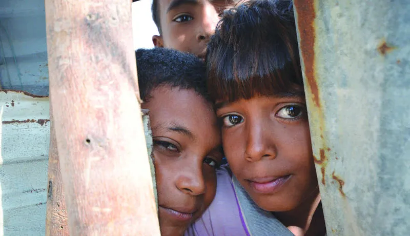 صبيان يمنيان ينظران من خلال جدار بكوخ في أحد الأحياء الفقيرة بمدينة الحديدة الساحلية المطلة على البحر الأحمر (رويترز)