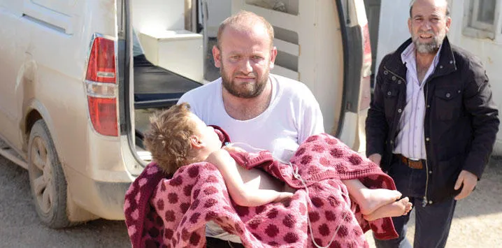 رجل من مدينة أعزار بريف حلب قرب الحدود التركية يحمل طفلة مصابة جراء هجمات جوية روسية على المنطقة أمس (غيتي)