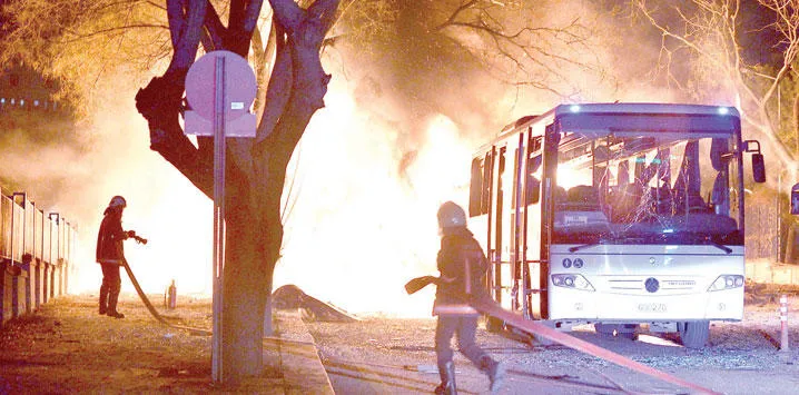 رجال الإطفاء يستعدون لإخماد حريق سببه انفجار إرهابي في أنقرة أمس (رويترز)