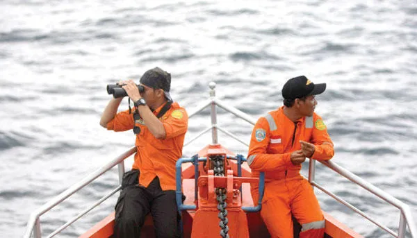 عنصران من فرق البحث الإندونيسية يبحثان عن حطام محتمل للطائرة الماليزية المفقودة قرب جزيرة سومطرة أمس (إ.ب.أ)