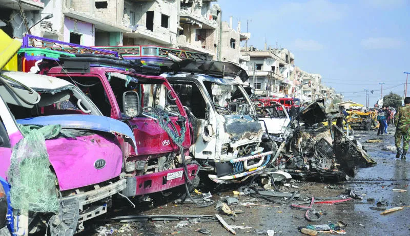 سيارات في مدينة حمص وسط سوريا دمرها تفجير مزدوج لسيارتين في حي موالٍ للنظام، أمس، حيث تجاوز عدد القتلى 30 شخصا (إ.ب.أ)