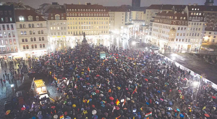 متظاهرون تابعون لحركة «بيغيدا» المتطرفة يحتجون ضد اللاجئين في مدينة دريسدن الألمانية أمس (إ.ب.أ)