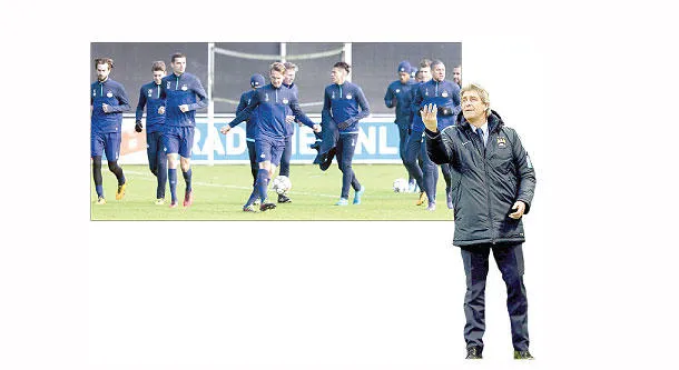 بيليغريني مدرب سيتي مطالب برد فعل قوي أمام دينامو كييف اليوم (إ.ب.أ) و لاعبو آيندهوفن خلال التدريبات أمس استعدادًا لمواجهة أتليتكو مدريد (أ.ف.ب)
