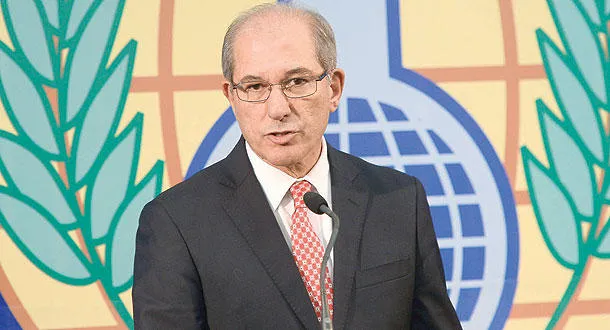 أحمد أزومجو رئيس منظمة حظر الأسلحة الكيماوية خلال مؤتمر صحافي بشأن سوريا في لاهاي أمس (رويترز)