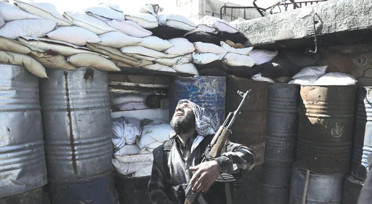 مقاتل معارض من {فيلق الرحمن} في أحد المواقع القتالية ضد قوات النظام في عربين إحدى قرى ريف دمشق (أ.ف.ب)