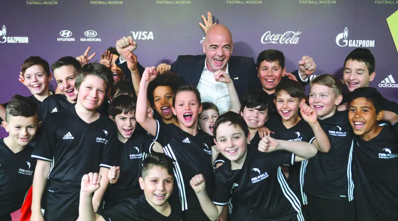 إينفانتينو رئيس «فيفا» الجديد مع تلاميذ مدرسة كرة قدم خلال افتتاح متحف الاتحاد الدولي أمس (أ.ف.ب)