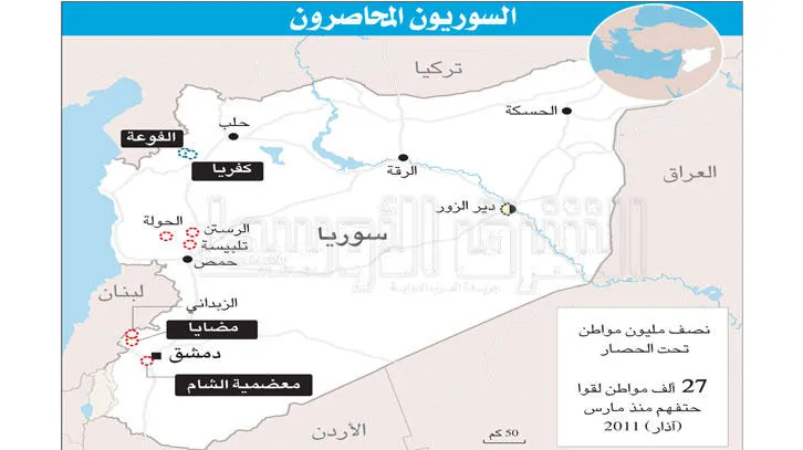 وتوفي نحو خمسين شخصا في بلدة مضايا، الواقعة في ريف دمشق نتيجة نقص المواد الغذائية بسبب حصار تفرضه قوات النظام على البلدة منذ نحو سنتين، بحسب منظمة «أطباء بلا حدود». ولم تستقبل مضايا المحاصرة أية مساعدات أو قوافل إغاثية تابعة للأمم المتحدة.