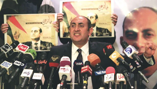 خالد علي خلال إعلانه الإحجام عن خوض انتخابات الرئاسة المصرية في مؤتمر صحافي بالقاهرة أمس (رويترز)