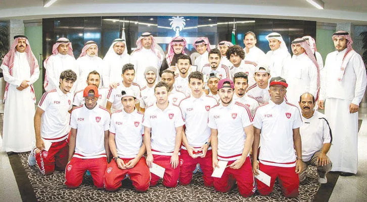 الأمير الوليد بن طلال في لقطة تذكارية مع إدارة ولاعبيه نادي حطين («الشرق الأوسط»)