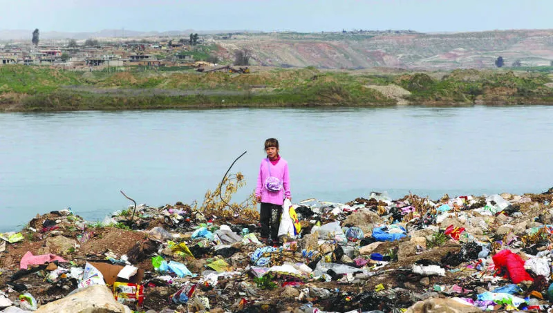 صبية عراقية تنبش بين أكوام القمامة بحثاً عن أي شيء قابل للاستهلاك بجانب نهر دجلة قرب مدينة الموصل (أ.ف.ب)