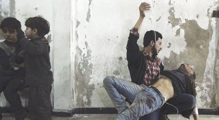 عامل في مجال الإغاثة الطبية يساعد مصابًا جراء قصف جوي على دوما في فبراير العام الماضي (رويترز)