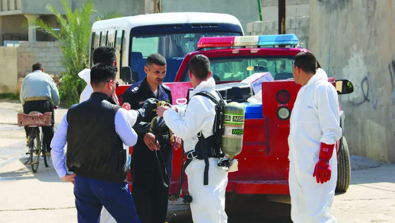 عناصر من المباحث الجنائية العراقية في قرية تازة بعد أنباء عن ضربها بمواد كيميائية من قبل {داعش} (أ.ف.ب)
