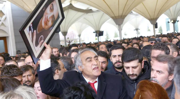 والد الشاب الفين بورغا أرسلان الذي لقي حتفه في تفجير أنقرة الإرهابي يحمل صورته أثناء تشييع جثمانه بين أقاربه أمس (أ.ف.ب)