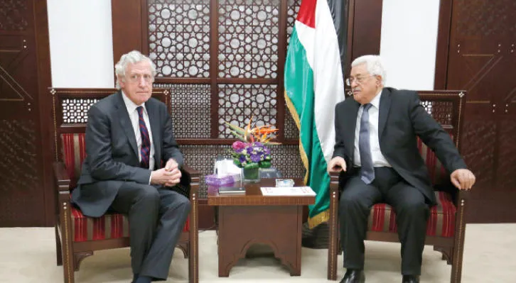 الرئيس الفلسطيني محمود عباس لدى استقباله المبعوث الفرنسي بيير فيمونت في رام الله أمس (أ.ف.ب)