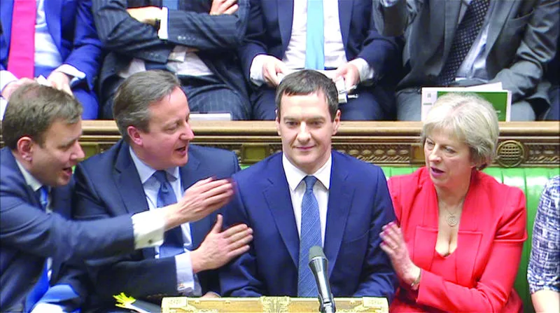 وزير الخزانة البريطاني جورج أوزبورن بعد تقديمه خطة الميزانية التي قدمها بينما يحيه رئيس الوزراء ديفيد كاميرون (وسط) أمس (رويترز)