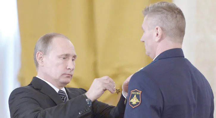 الرئيس بوتين يقلد أحد الضباط وسام «بطل روسيا»، مع ميدالية «النجمة الذهبية» خلال مراسم تكريم الجنود العائدين من سوريا (إ.ب.أ)