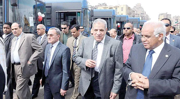 رئيس الوزراء المصري المهندس إبراهيم محلب خلال تفقده مع وزراء حافلات جديدة للنقل العام في القاهرة أمس (الصورة من موقع الحكومة المصرية)