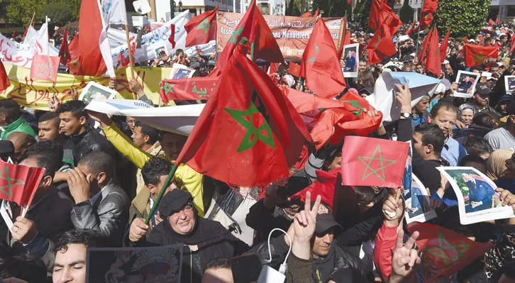 آلاف المغاربة يحملون الأعلام الوطنية خلال مظاهرة ضد تصريحات الأمين العام للأمم المتحدة بشأن الصحراء في العاصمة الرباط الاسبوع الماضي (أ.ف.ب)
