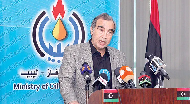وزير النفط الليبي عمر شقمق يتحدث في مؤتمر صحافي في طرابلس أمس (رويترز)