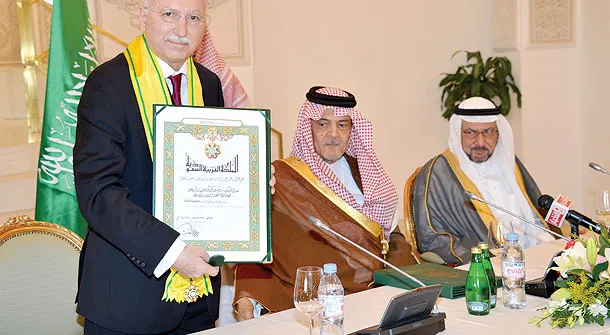 سعود الفيصل يقلد أكمل الدين إحسان أوغلي وشاح الملك عبد العزيز من الطبقة الثانية