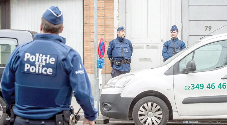 رجال الشرطة البلجيكية يحرسون المنزل الذي اختبأ فيه المطلوب الأول صلاح عبد السلام في حي مولنبيك عقب مداهمته أول من أمس (إ.ب.أ)