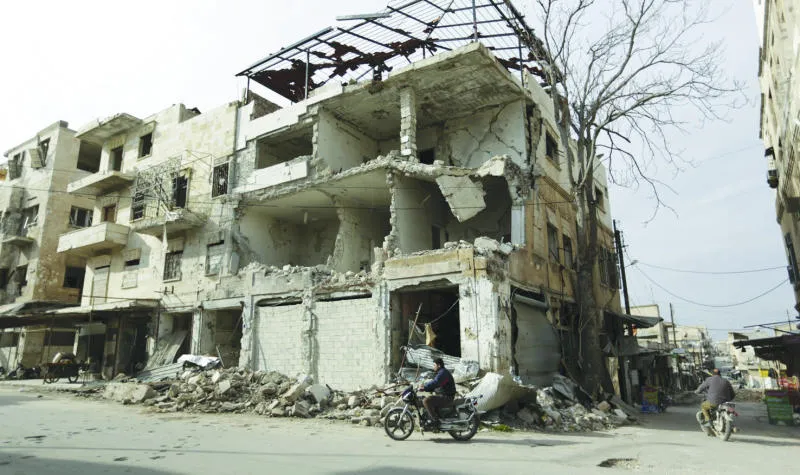 سوري يستقل دراجته النارية قرب مبنى مدمر في معرة النعمان بمحافظة إدلب أول من أمس (رويترز)