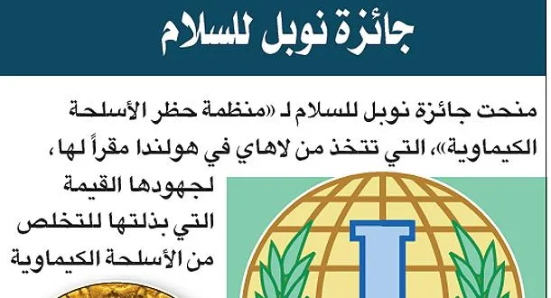 أعلنت اللجنة المانحة لجائزة نوبل أن منظمة حظر الأسلحة الكيماوية التي تشرف على تدمير ترسانة الأسلحة الكيماوية السورية فازت بجائزة نوبل للسلام لعام 2013 أمس. ويعمل خبراء من المنظمة الدولية ومقرها لاهاي بدعم من الأمم المتحدة لتدمير مخزونات سوريا الكبيرة من الأسلحة الكيماوية بعد هجوم بغاز السارين على ضواحي دمشق أسفر عن مقتل أكثر من 1400 شخص في أغسطس (آب) الماضي.