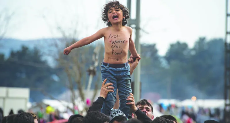 مهاجرون وطالبو لجوء يحملون طفلا في مظاهرة في أحد المخيمات القريبة من ادوميني على الحدود اليونانية - المقدونية أمس (أ.ف.ب)