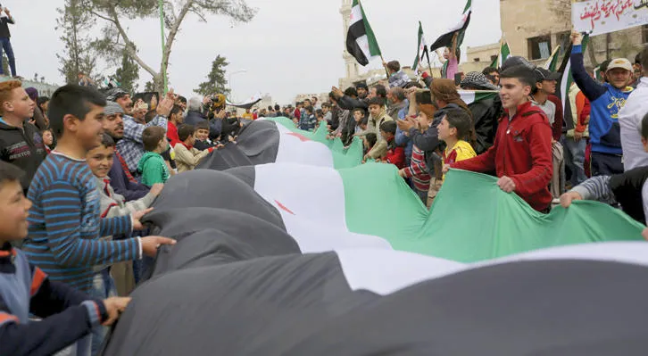 متظاهرون يحملون علم المعارضة خلال مشاركتهم في احتجاجات ضد النظام في منطقة معرة النعمان في إدلب (رويترز)