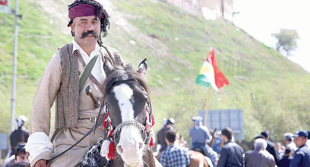 كردي باللباس التقليدي يمتطي حصانا خلال فعالية ضمن مهرجان «الحرية ونوروز» الذي تشهده أربيل هذه الأيام (أ.ف.ب)