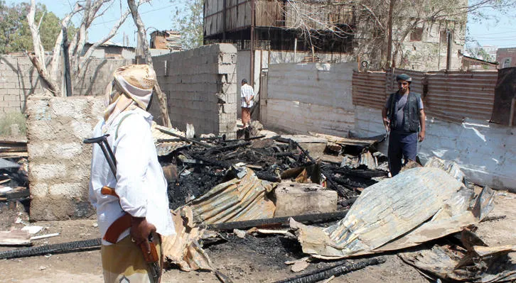 يمنيون يعاينون الدمار الذي نتج عن انفجار قنبلة تسبب في مقتل مسلحين تابعين لـ{القاعدة» كانوا يريدون نقلها في حي دار سعد جنوب عدن («غيتي»)