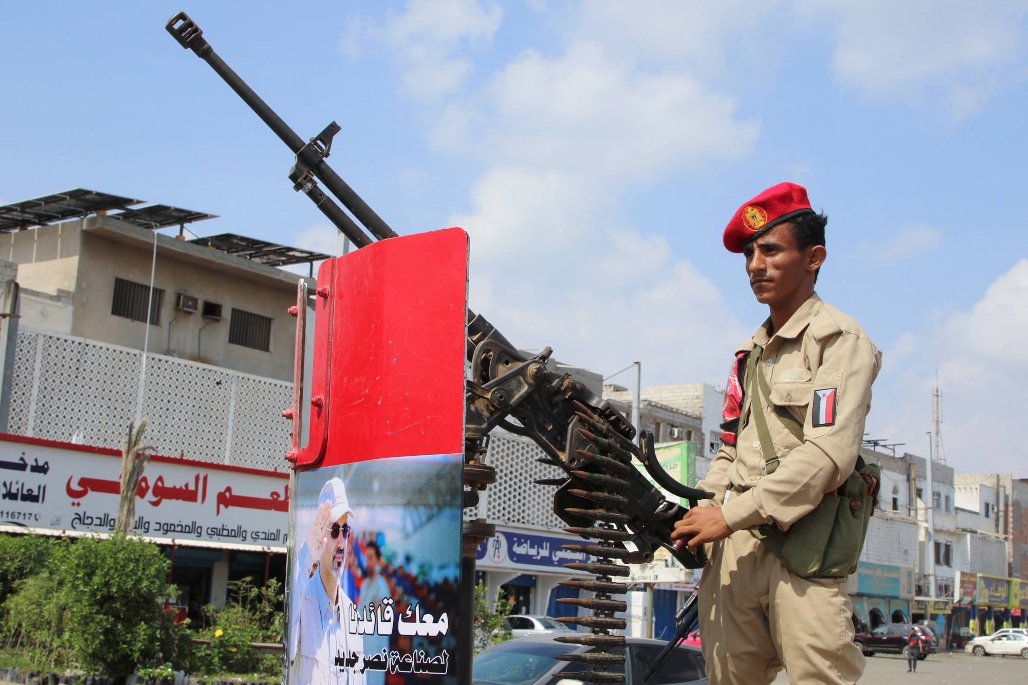 أحد أفراد الشرطة العسكرية الموالية للمجلس الانتقالي الجنوبي المنحل على متن سيارة دورية (رويترز)