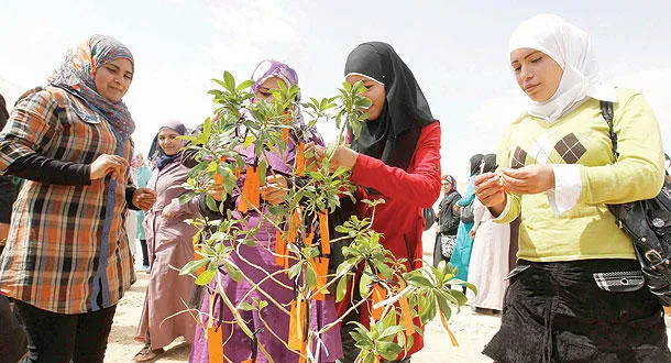 صبيات سوريات يكتبن أمنياتهن ويعلقنها على شجيرة في مخيم الزعتري للاجئين، أمس (رويترز)