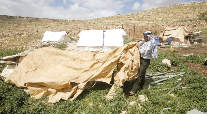 فلسطيني يلملم خيمته التي أسقطتها القوات الإسرائيلية في منطقة {خربت تانا} قرب مدينة نابلس بالضفة الغربية أمس (رويترز)