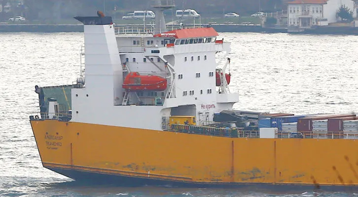 السفينة الروسية «ألكسندر تكاشينكو» تبحر في مضيق البوسفور مستهل فبراير الماضي في طريقها إلى البحر الأبيض المتوسط باتجاه السواحل السورية (رويترز)