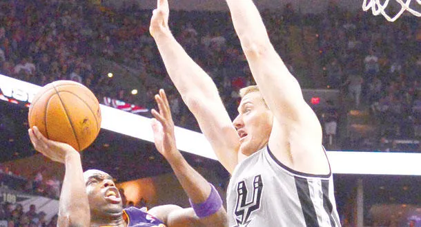 لاعب لوس أنجليس ليكرز جودي ميكس يسدد نحو البرج وسط مضايقة لاعب سان أنطونيو آرون باينيس