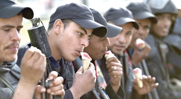 جنود مصريون يتناولون المثلجات في لحظات استراحة وسط اشتباكات مع طلاب تابعين لجماعة الإخوان أمام جامعة القاهرة أول من أمس (أ.ف.ب)