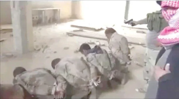 ولا يقل المسلحون الذين يقاتلون الحكومة وحشية. ففي تسجيل مصور بثه أنصار تنظيم داعش على الإنترنت ثم تداوله الجنود العراقيون الغاضبون ونشطاء مؤيدون للحكومة يظهر مسلح يصوب مسدسه فوق صف من الجنود الراكعين على الأرض. ويسمع صوت يقول: «اللهم تقبل هذه الأضحية».