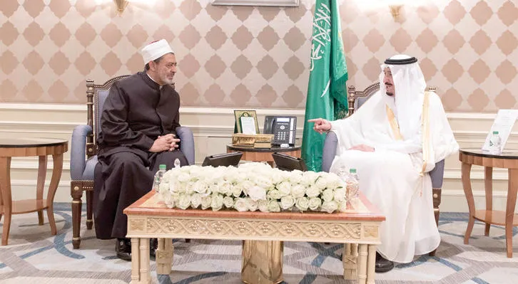 أعرب خادم الحرمين الشريفين الملك سلمان بن عبد العزيز، عن أهمية دور الأزهر في نشر العلم الشرعي وخدمة قضايا الأمة الإسلامية، وذلك لدى لقائه أمس في مقر إقامته بالعاصمة المصرية، الدكتور أحمد الطيب شيخ الأزهر، الذي رحب بدوره باسمه واسم علماء وطلاب الأزهر بخادم الحرمين الشريفين في زيارته التاريخية لجمهورية مصر العربية، معربا عن شكره للملك سلمان على ما توليه السعودية من دعم ورعاية بالأزهر.