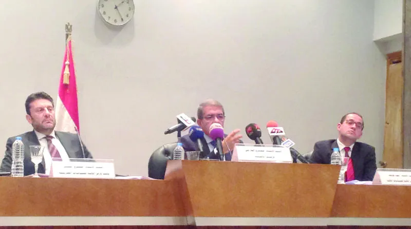 وزير المالية المصري عمرو الجارحي أثناء مؤتمر صحافي أمس ({الشرق الأوسط})