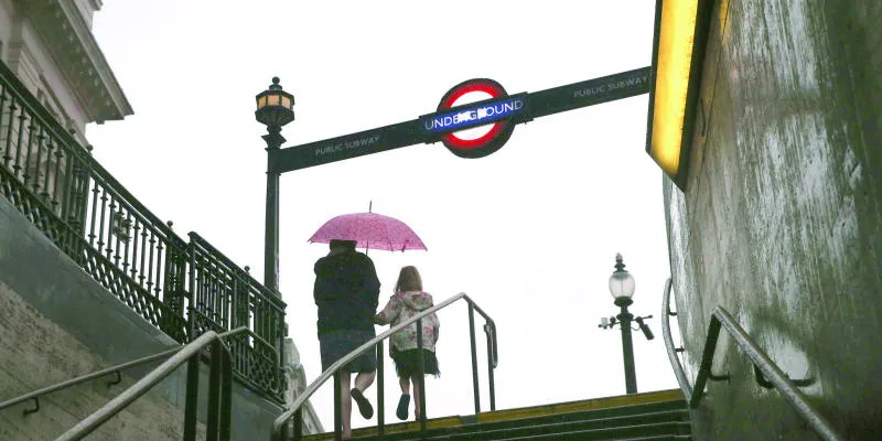 لقطة لمدخل محطة مترو بيكاديلي سيركس وسط العاصمة لندن وسط هطول أمطار غزيرة (غيتي)