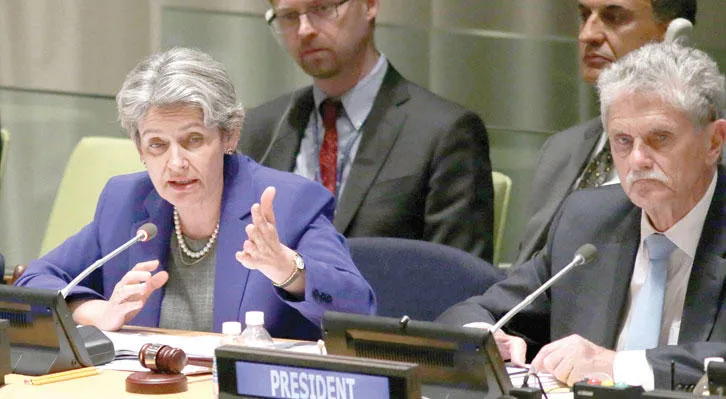رئيس الجمعية العامة للدورة السبعين مونز ليكتوفت يستمع إلى إيرينا بوكوفا مديرة اليونيسكو البلغارية خلال كلمتها للإقناع بأهليتها لشغل منصب الأمين العام للأمم المتحدة (أ.ف.ب)